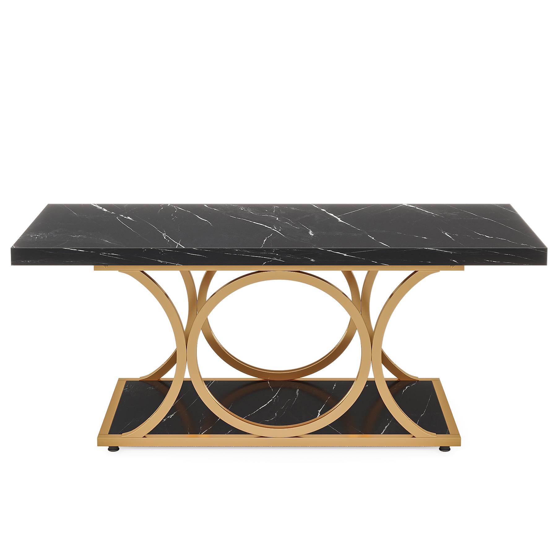 This 47.24"L × 23.62" W × 18.89"H coffee table, with a faux marble top and metal ring legs, comes in black-gold, white-gold, and wood-tone metal. Versatile for living rooms, studios, or entryways, it has rounded edges for safety and anti-slip foot pads to protect floors. The two-tier design with a 33.46"L × 15.74"W lower shelf keeps spaces tidy. Made of 1.57-inch E1-grade particleboard and sturdy metal, it supports 200 lbs, with a waterproof, scratch-resistant melamine top that’s easy to clean—ideal for work or dining.