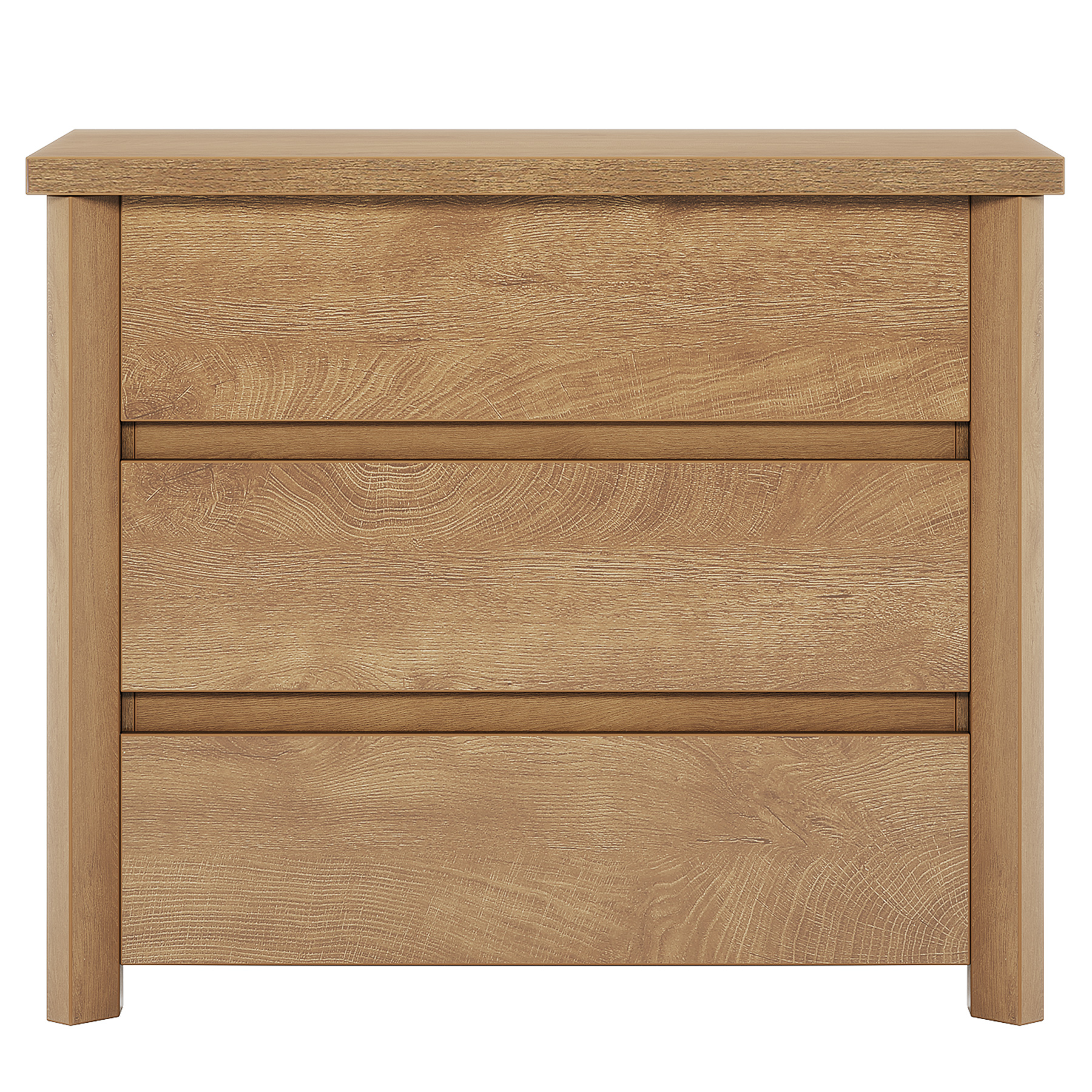 It features three spacious drawers, with the overall dimensions of this nightstand being 31.5 inches in width, 17.72 inches in depth, and 26.38 inches in height, and each drawer measures 25.98 inches in width, 13.78 inches in depth, and 7.09 inches in height, providing ample space to store all essentials, and each drawer of the nightstand opens and closes smoothly for easy access.