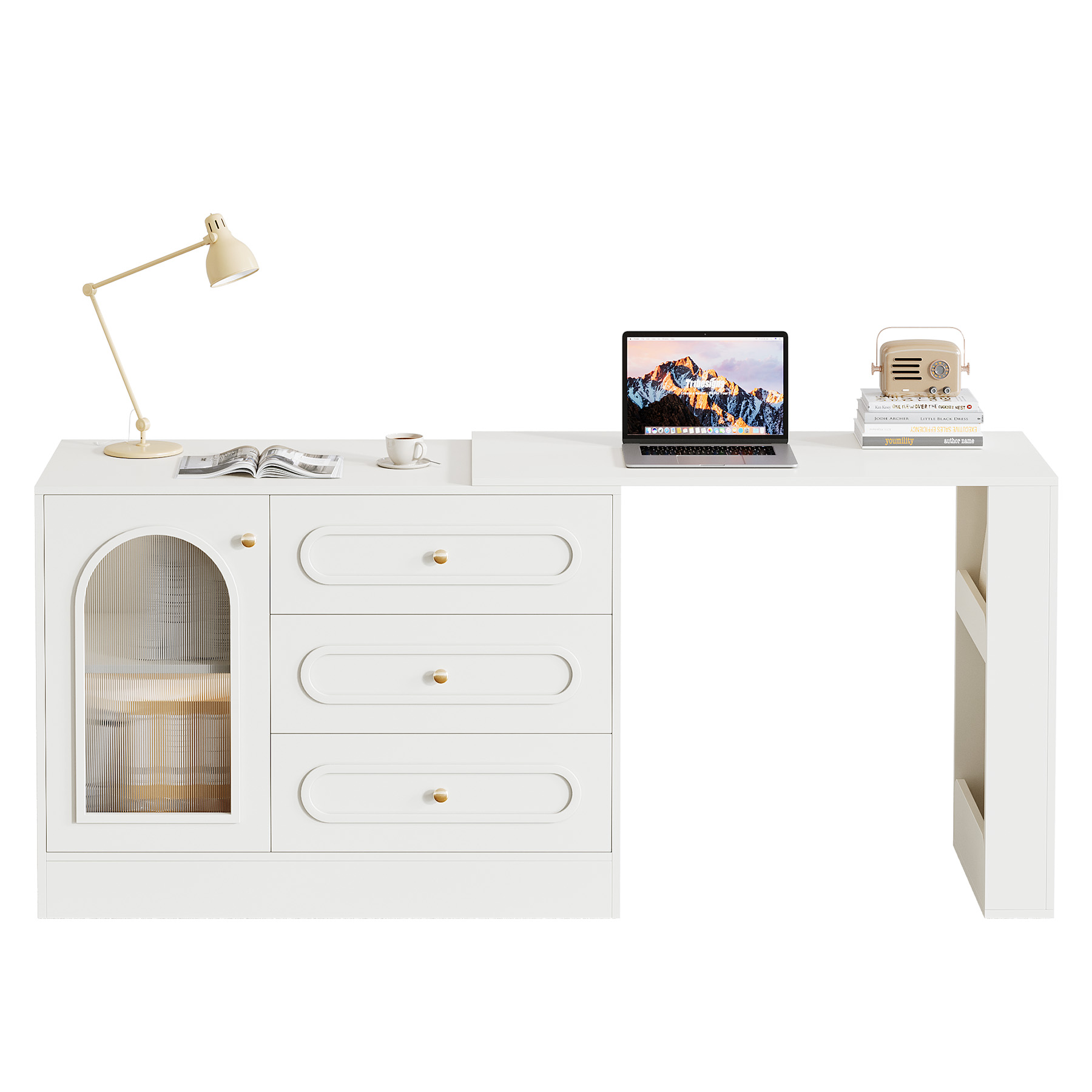 This modern light-luxury desk has a sleek white finish, embossed patterns and metal handles. With an L-shape, 360° swivel and extendable desktop, it fits home offices, bedrooms or gaming setups. It offers 3 drawers, a filing cabinet with adjustable shelves, an open compartment and a reversible layout for storage. Made of high-quality MDF, it’s sturdy for daily use and heavy items. The glossy, waterproof and scratch-resistant surface, smooth quiet drawers and easy-to-clean top enhance usability. Rotatable and extendable, it adapts to spaces. Easy to assemble with reliable after-sales service, it delivers long-term value.