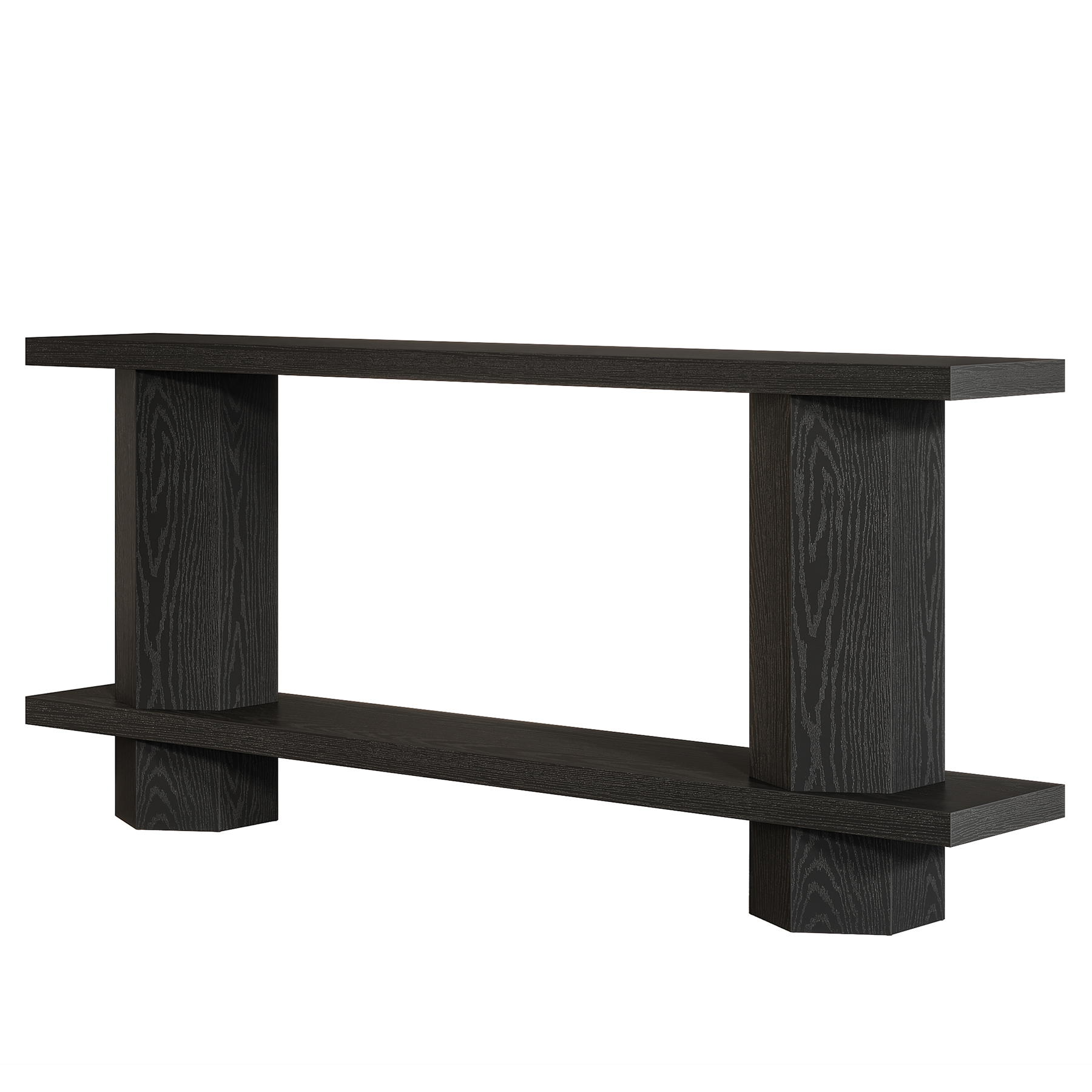 "Boasting a distinctive rectangular shape and an eye-catching hexahedron leg design, the console table merges audacity and finesse, infusing spaces with an inspiring aesthetic. Available in brown and black color variants, it caters to diverse interior styles, making it a standout console sofa table.