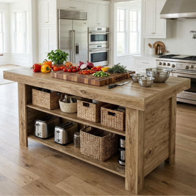 This Fnova kitchen island features a 55.11" L x 31.5" W worktop ideal for meal prep and casual dining, with oak woodgrain farmhouse style. This stationary island table storage cabinet offers two open shelves for cookware and essentials, keeping your kitchen organized. Made of premium MDF with a scratch-resistant, waterproof surface, it’s sturdy and easy to clean. All hardware and clear instructions are included for hassle-free assembly, backed by reliable customer service.