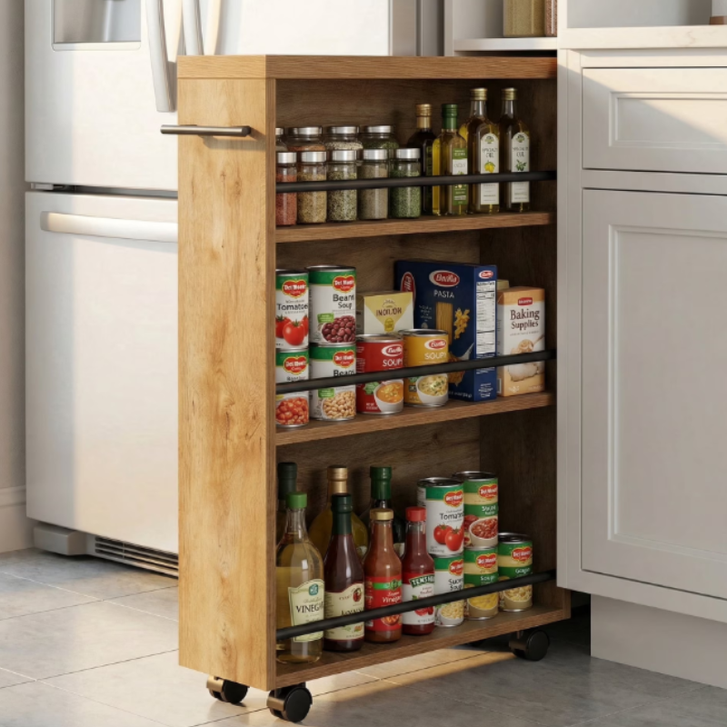 This Fnova slim storage cart is ideal for narrow gaps between cabinets and fridges, maximizing tight spaces. It features 3-tier open shelves with guardrails to prevent items from falling, and supports up to 25 lbs per shelf. Equipped with 360° swivel casters (2 lockable) and a side handle for easy mobility. Made of thick engineered wood and a sturdy black metal frame, it is sturdy and easy to clean. All hardware and instructions are included for quick assembly, backed by reliable customer service.