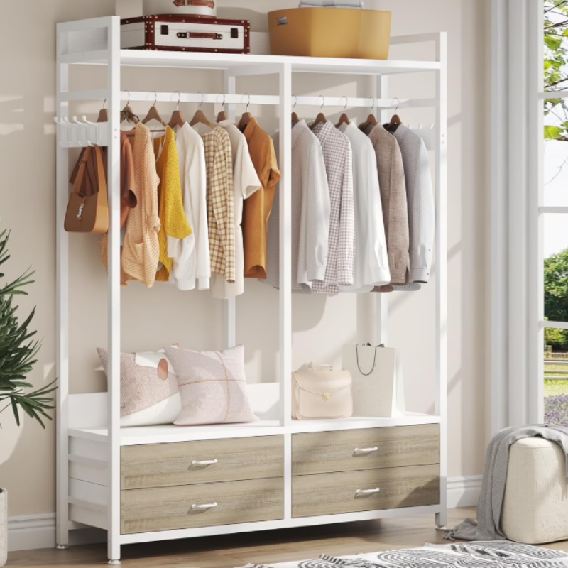 This heavy-duty Fnova garment rack features a 47’’ hanging rod, top/bottom shelves, 4 drawers, and 8 hooks to keep clothes, shoes, and accessories neatly organized. Its thickened metal frame ensures strong bearing capacity and includes anti-tip straps for safety. With rustic wood and a retro industrial style, this closet organizer fits any decor. All hardware and instructions are included for quick assembly, backed by reliable customer service.