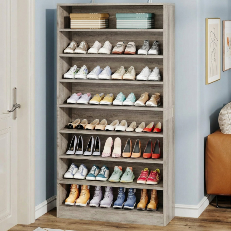 This Fnova 8-tier adjustable shoe rack holds 32–35 adult or 40–45 kids’ shoes, ideal for collectors and daily use. Its tall, narrow design maximizes vertical space in entryways, closets, and bedrooms. Made of thick E1-grade particle board with non-slip feet, this shoe rack is sturdy and floor-friendly. Versatile for shoes, bags, and decor, it features a simple modern style. Clear instructions and tools are included for assembly, with 24/7 customer support available.