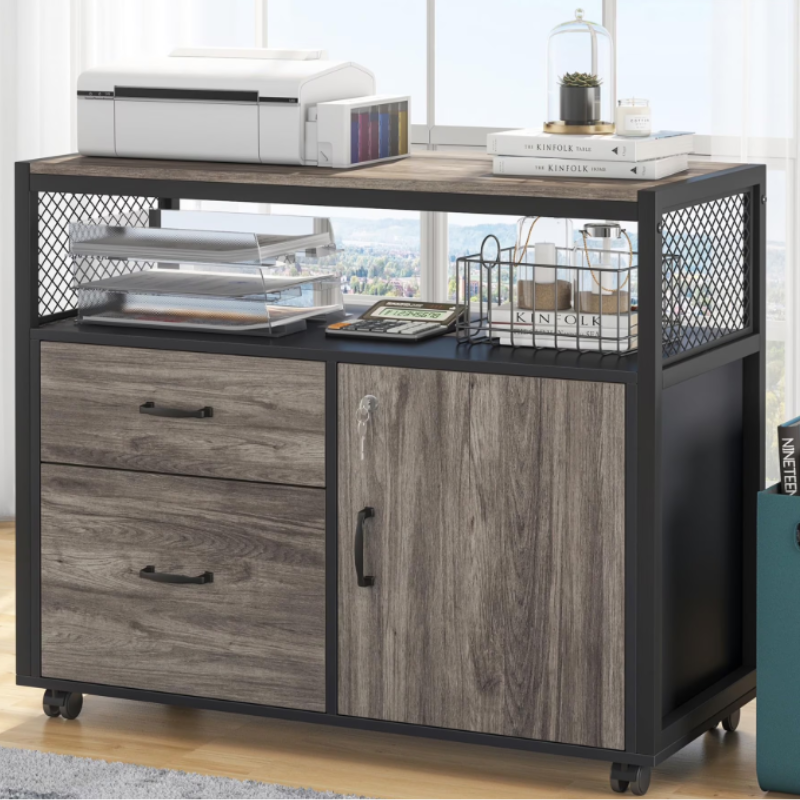 This Fnova file cabinet combines style and function for your home office. This cabinet features 2 drawers (one for letter-sized files), open shelves, a lockable cabinet door, and 4 rolling casters for mobility. Built with particle board and metal frame for stability, it keeps documents secure and organized. All hardware and instructions included. A sleek, practical storage solution to upgrade your workspace!