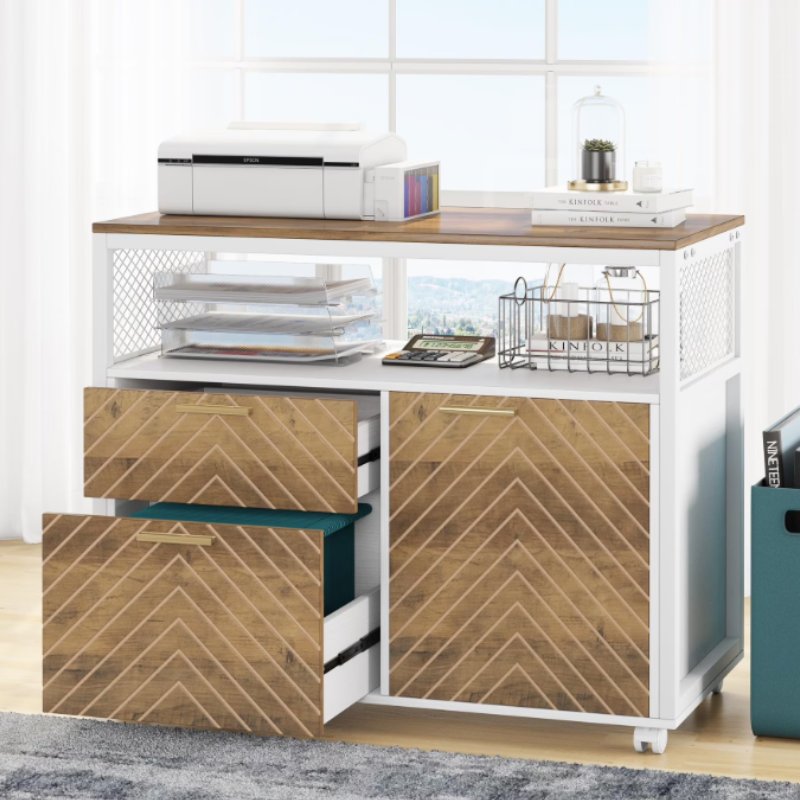 This Fnova file cabinet delivers stylish storage for your home office. This cabinet features two drawers (one for letter-sized files), open shelves, and a filing cabinet door for secure document storage. Supported by a sturdy metal frame and particle board, it includes four smooth-rolling casters for easy mobility. All hardware and clear instructions are included. A sleek, secure, and versatile organizer to elevate your workspace!