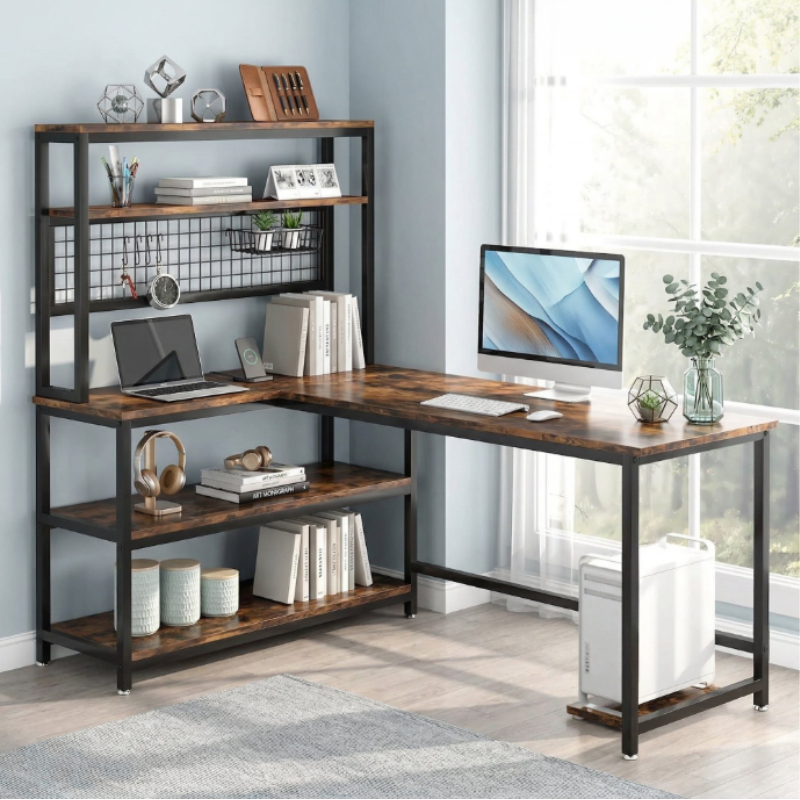 - Fnova L-Shaped Gaming Desk Computer Desk, 55" Reversible Office Desk Study Writing Table with Wireless Charging and Bookshelf for Home Office, Brown