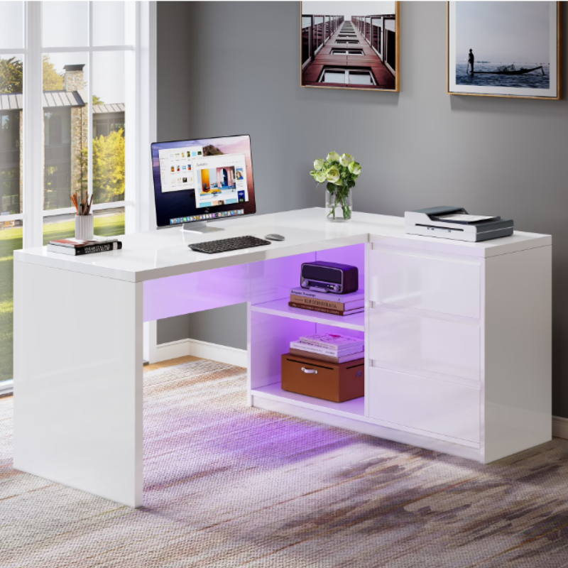 - Fnova 55-Inch L-Shaped Computer Desk with 3 Drawers, Modern Gloss Corner Home Office Executive Desk with LED Lights and 2 Storage Shelves for Work Study Writing, White