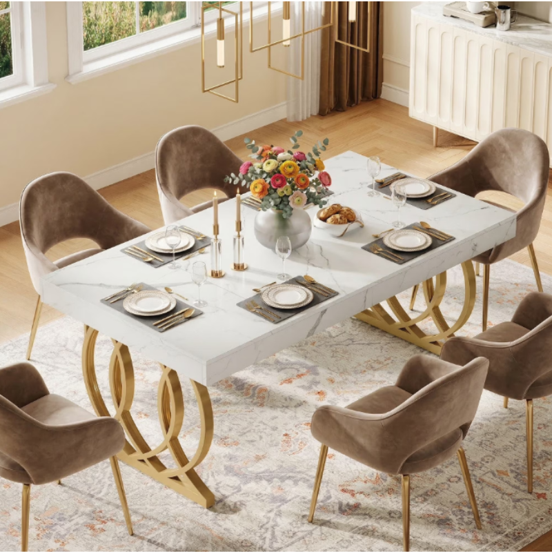 This Fnova modern rectangular dining table features a white faux marble top and gold geometric legs for a luxurious look. Measuring 62.99"L x 31.5"W, it seats 4–6 people comfortably. The thick, scratch-resistant top and sturdy metal legs support up to 350 lb for lasting stability. Versatile as a dining table, desk, or conference table. Easy to assemble with all tools included – an elegant, functional upgrade for your dining room or home office!