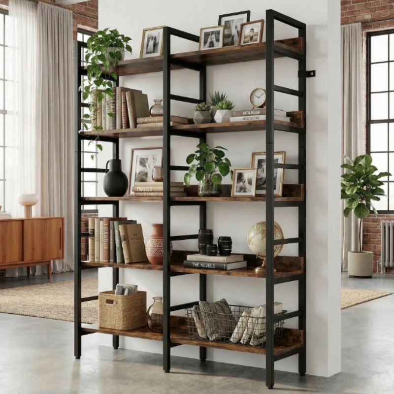 This Fnova 5-tier wide bookshelf (47"W×11.8"D×70.9"H) offers ample open storage for books and decor. Built with quality wood and a sturdy metal frame, it features anti-tip hardware, adjustable foot pads, and a scratch-resistant surface. Its rustic retro industrial design fits any room. Easy to assemble with all tools included—stylish, safe, and durable for your home!