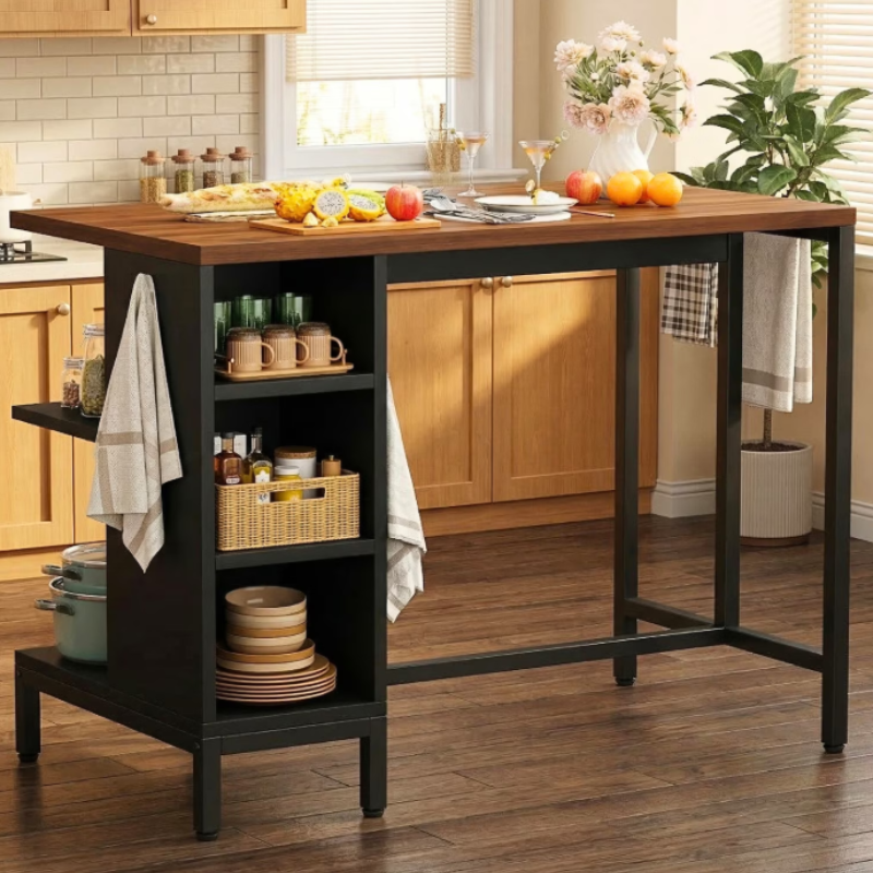 This Fnova industrial kitchen island features a dark walnut wood-grain top and black metal frame, pairing chic style with strong function. It has a 43.3"×23.6" worktop and 5 open shelves for ample kitchen storage. Built to last with quality board and sturdy frame, plus adjustable foot pads for stability. Versatile as a prep table, coffee bar, or dining unit. Easy to assemble with all parts included—your perfect multi-use home essential!