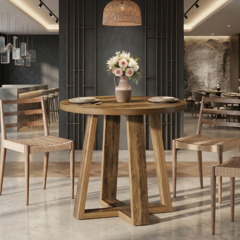 This Fnova 31.5" small round farmhouse dining table seats 2–4 people, ideal for compact kitchens and apartments. This dining table showcases a rustic brown finish that blends beautifully with home decor. Built with a 1.18" thick waterproof MDF top and sturdy base for daily use. Versatile as a dining table, coffee table, or workstation. Easy to assemble with marked parts and instructions included—a practical, charming choice for your home!