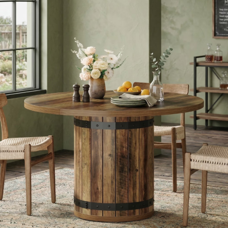 This Fnova 39.37" round farmhouse dining table features a rustic brown finish and unique fence pedestal base for warm, charming appeal. This kitchen table seats up to 4 people, ideal for family meals and gatherings. Made of premium MDF with a stable, wobble-free base. All hardware and instructions are included for easy assembly. A sturdy, cozy, and stylish centerpiece for your kitchen or dining room!