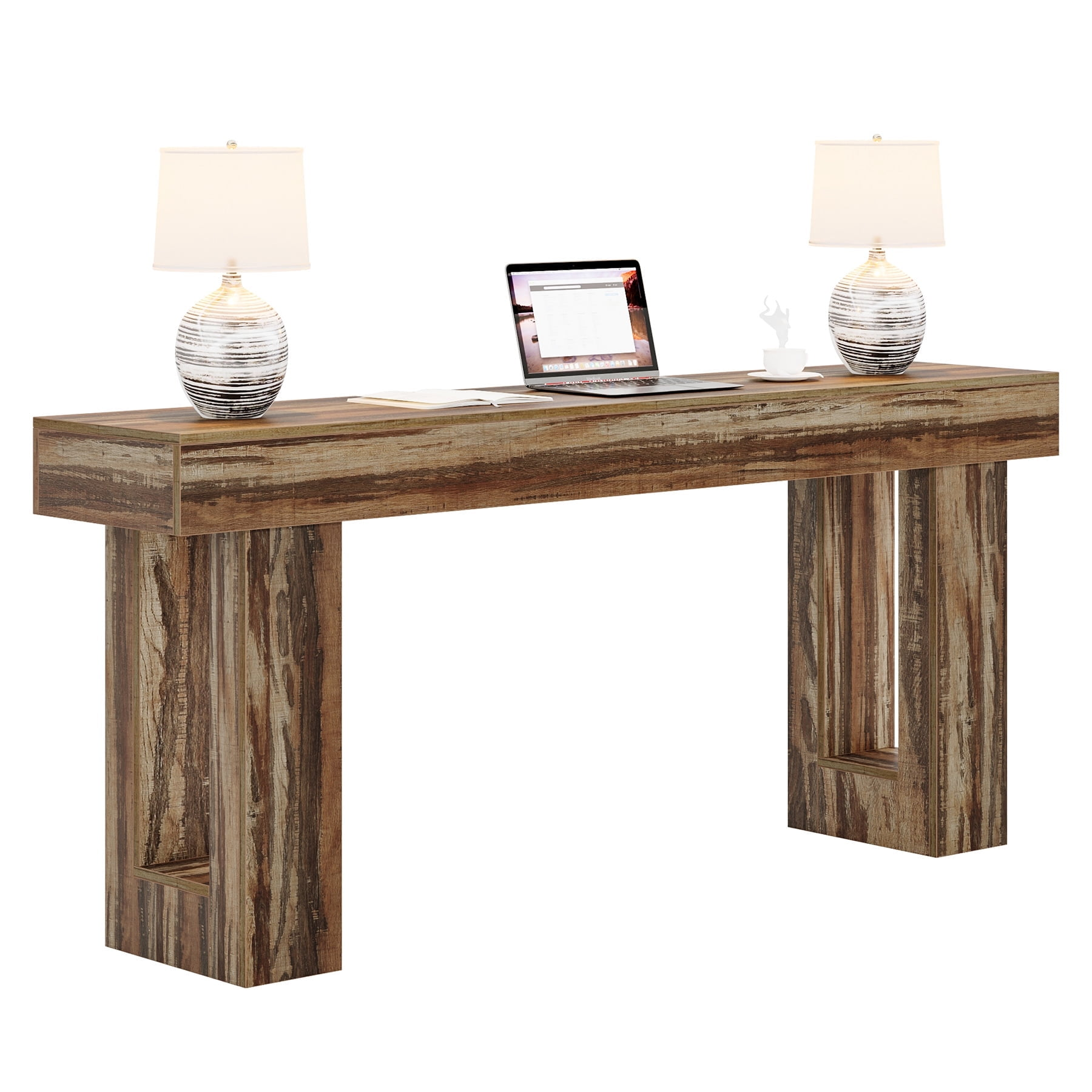- Crafted from high-quality MDF with natural wood grain textures, this farmhouse-style entryway console table exudes rustic charm. Standing at 33.36 inches tall with a 62.89" x 13.67" tabletop (5.8" thick), it fits perfectly in entryways or serves as a living room sofa table. The surface treatment combines visual appeal with durability, ideal for modern rustic or transitional decor.