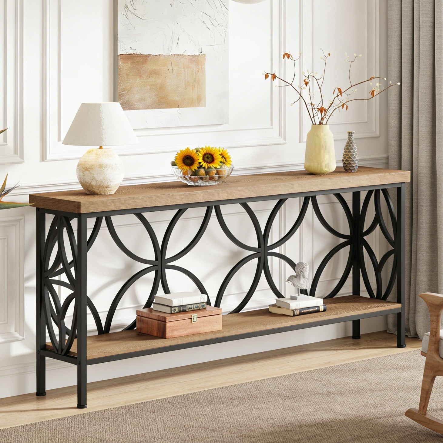 - Fnova 70.9" Industrial Console Table, 2-Tier Wood Storage Narrow Sofa Table, Behind Couch with Metal Frame, for Living Room, Entryway, Foyer, Easy Assembly
