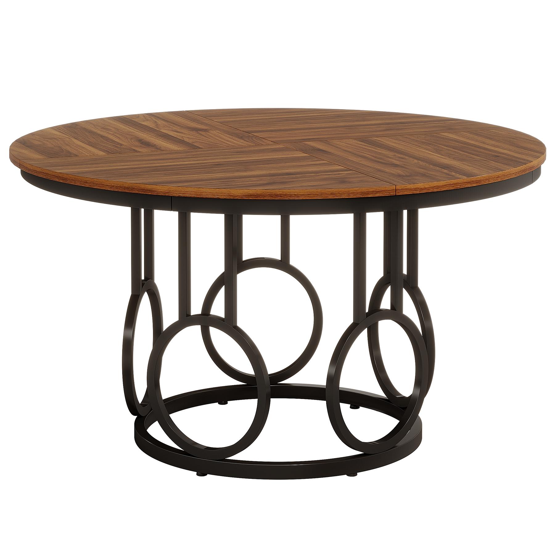 The round dining table, sized at 47.24"W x 47.24" D x 29.53" H, comfortably seats 4-6. The 0.59" thick MDF tabletop is waterproof, scratch-resistant, and easy to clean. This dining table features rounded edges for safety, while adjustable foot pads ensure stability on uneven floors. The walnut tabletop and black metal frame create a classic rustic aesthetic, ideal for your dining areas.