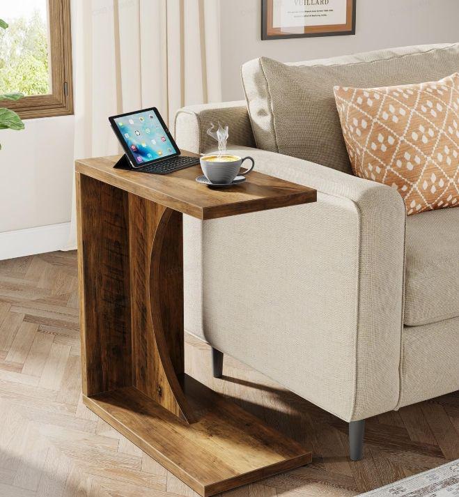 - Fnova End Table Farmhouse C-shaped Side Table, Narrow Wooden Sofa Table with Space-Saving Design, Modern Bedside Table, Easy Assembly, Corner Table for Living Room, Bedroom, Nightstand