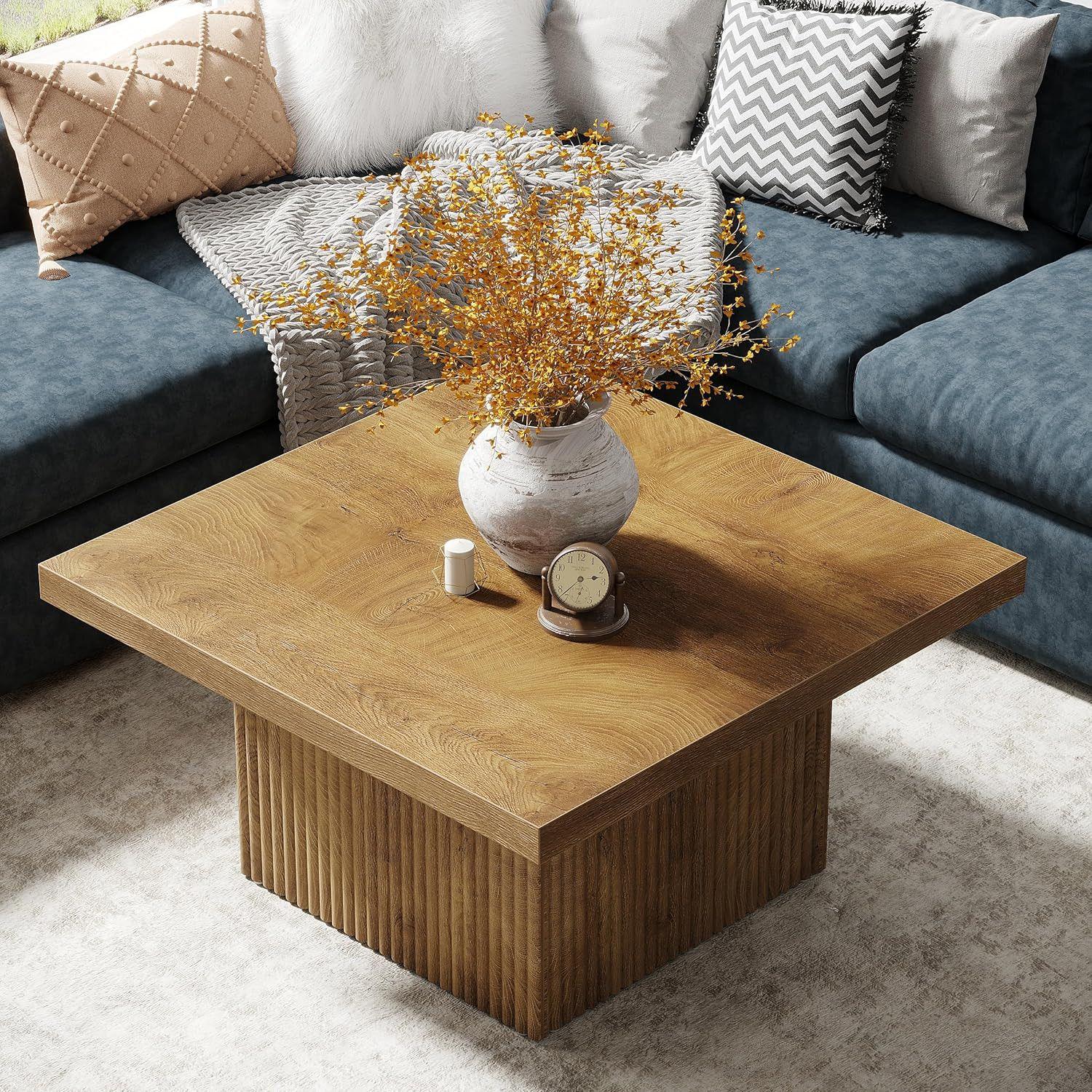 Elevate your living room with our 31.5"" square coffee table. Transform your living space with this stylish and sturdy square coffee table. The coffee table features a 1.77-inch-thickened tabletop that delivers enhanced structural stability, perfect for holding heavy items like books, decor. With dimensions of 31.5"" x 31.5"", this square coffee table fits seamlessly in living spaces. 4 thick ribbed boards make a sturdy and stylish Pedestal base while the rich wood grain adds warmth and sophistication to your decor, fitting farmhouse, modern, or minimalist styles.