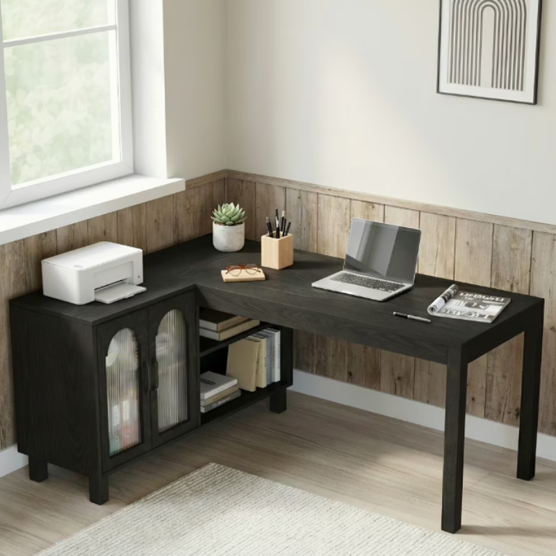 This Fnova L-shaped desk features a classic black finish and sleek corner design, bringing elegant, upscale style to any home office. Constructed from premium MDF for exceptional stability, this office desk supports monitors and office gear while adjustable feet ensure steady placement. 2 closed shelves and 2 open shelves deliver generous storage, and the spacious dual work surface is ideal for multitasking. Ergonomic, comfortable, and easy to assemble—your perfect home office upgrade!