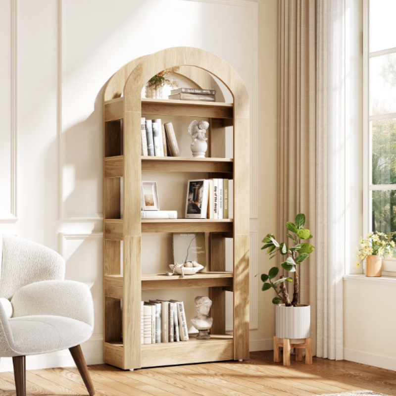 This Fnova tall arched bookcase features an elegant brown finish and farmhouse design, perfect for living rooms, bedrooms, home offices, and entryways. This display storage shelf offers 5 spacious open shelves, supporting up to 154 lbs, ideal for books, decor, and collectibles. Crafted from high-quality MDF for long-lasting stability, the bookshelf includes anti-tipping hardware for safety. Easy to assemble, clean, and versatile—an attractive storage upgrade for any home.