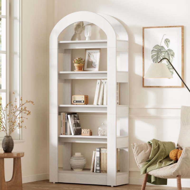 This Fnova tall arched bookcase features an elegant white finish and farmhouse design, perfect for living rooms, bedrooms, home offices, and entryways. This display storage shelf offers 5 spacious open shelves, supporting up to 154 lbs, ideal for books, decor, and collectibles. Crafted from high-quality MDF for long-lasting stability, the bookshelf includes anti-tipping hardware for safety. Easy to assemble, clean, and versatile—an attractive storage upgrade for any home.