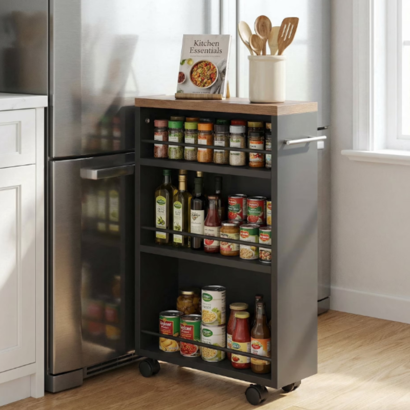 This Fnova slim storage cart is ideal for narrow gaps between cabinets and fridges, maximizing tight spaces. It features 3-tier open shelves with guardrails to prevent items from falling, and supports up to 25 lbs per shelf. Equipped with 360° swivel casters (2 lockable) and a side handle for easy mobility. Made of thick engineered wood and a sturdy black metal frame, it is sturdy and easy to clean. All hardware and instructions are included for quick assembly, backed by reliable customer service.