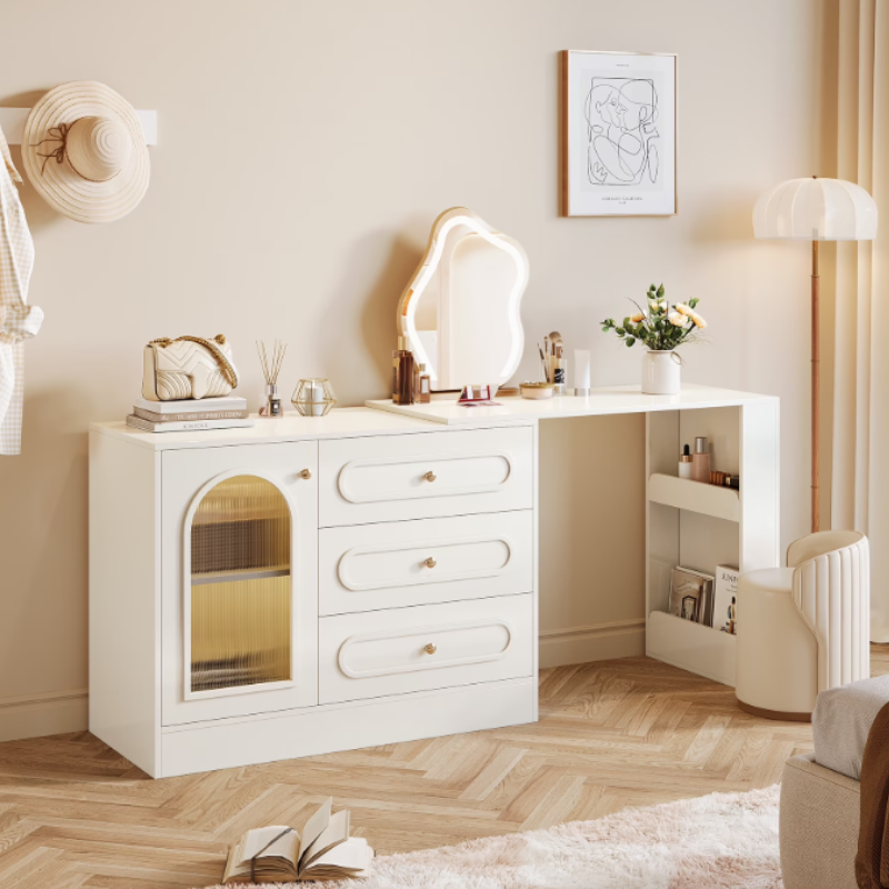 This Fnova white corner vanity desk features 3 drawers, an adjustable cabinet, and open storage for cosmetics and skincare. Its 360° rotatable tabletop offers flexible space for any bedroom. With an embossed design, gold handles, and a clear acrylic door, it brings modern luxury to your space. Smooth quiet slides ensure easy use. Stylish, functional, and space-saving – the ultimate elegant vanity upgrade for your home!