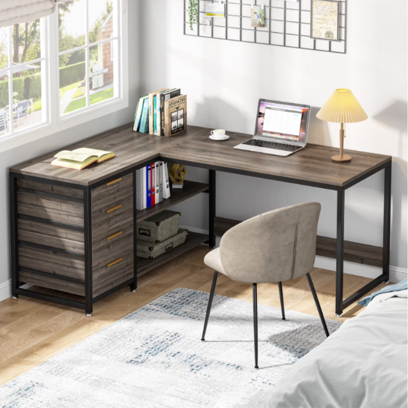 This Fnova reversible L-shaped desk features 2 spacious desktops, 2-tier open shelves, and 4 drawers for ample workspace and organized storage. Its sturdy metal frame and E1 particleboard ensure durability, with adjustable feet for stability. Boasting industrial style, it works as a computer, office, or study desk. Easy to assemble with clear instructions and tools – a practical, stylish centerpiece for your home office!