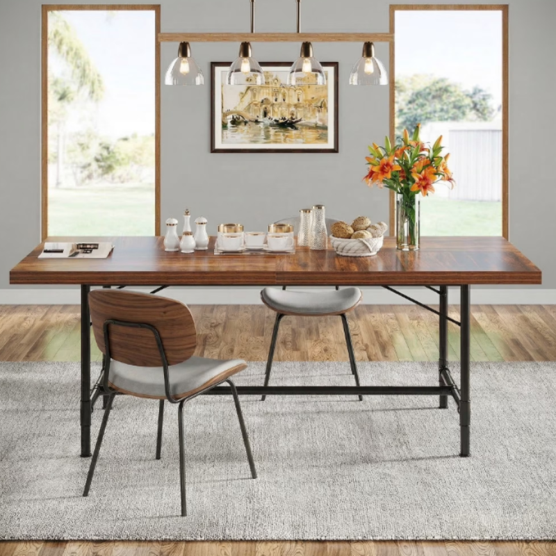 This Fnova 70.87" rectangular dining table blends rustic brown wood and a black metal frame for warm industrial style. It seats 6–8 people, perfect for gatherings and daily use. The thick, scratch-resistant tabletop and sturdy reinforced metal frame ensure lasting durability. Versatile as a dining table, desk, or conference table. Easy to assemble with all tools included – a sturdy, stylish, and multi-functional centerpiece for your home!