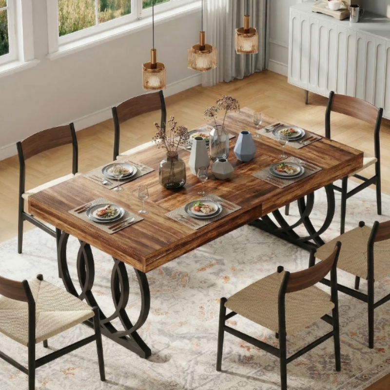 This Fnova farmhouse rectangular dining table features a rustic brown tabletop and black geometric legs for a elegant look. Measuring 62.99"L x 31.5"W, it seats 4–6 people comfortably. The thick, scratch-resistant top and sturdy metal legs support up to 350 lb for lasting stability. Versatile as a dining table, desk, or conference table. Easy to assemble with all tools included – an elegant, functional upgrade for your dining room or home office!