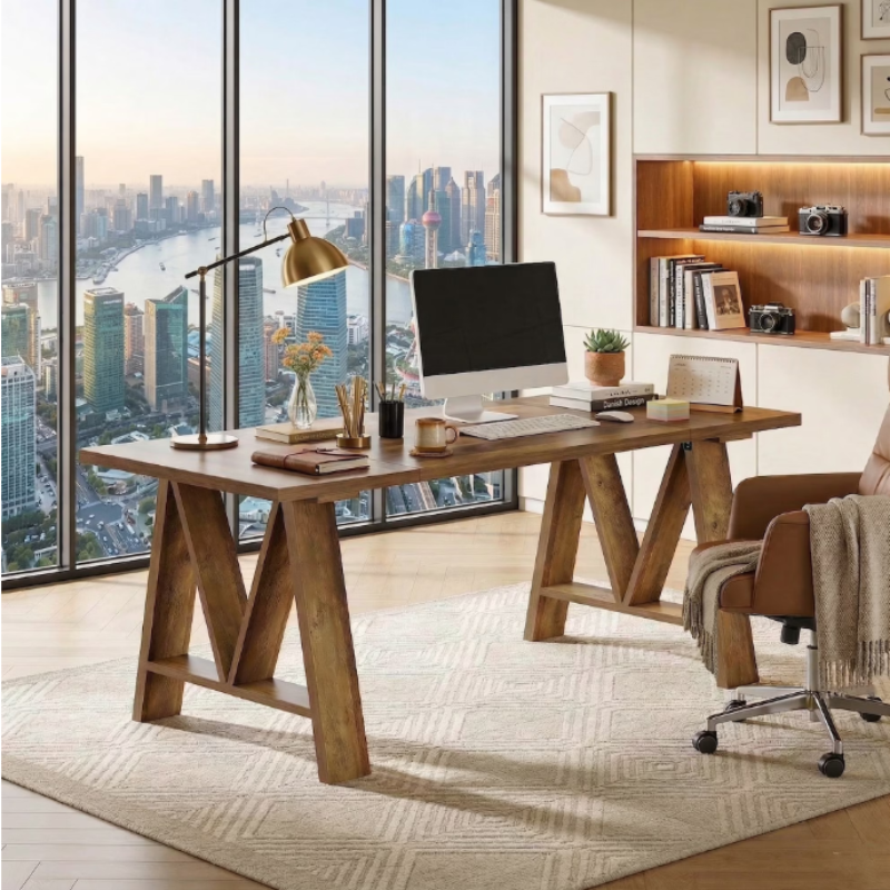 This Fnova 63" executive desk boasts a spacious work surface ideal for computers, paperwork, and multitasking. Featuring a warm brown farmhouse wood-grain finish, this office desk blends rustic charm with modern professionalism. Constructed from thick engineered wood for stability and durability, this wooden desk doubles as a writing, dining, or meeting table. Simple to assemble with labeled parts and clear instructions — a versatile, stylish centerpiece for your home office or workspace!