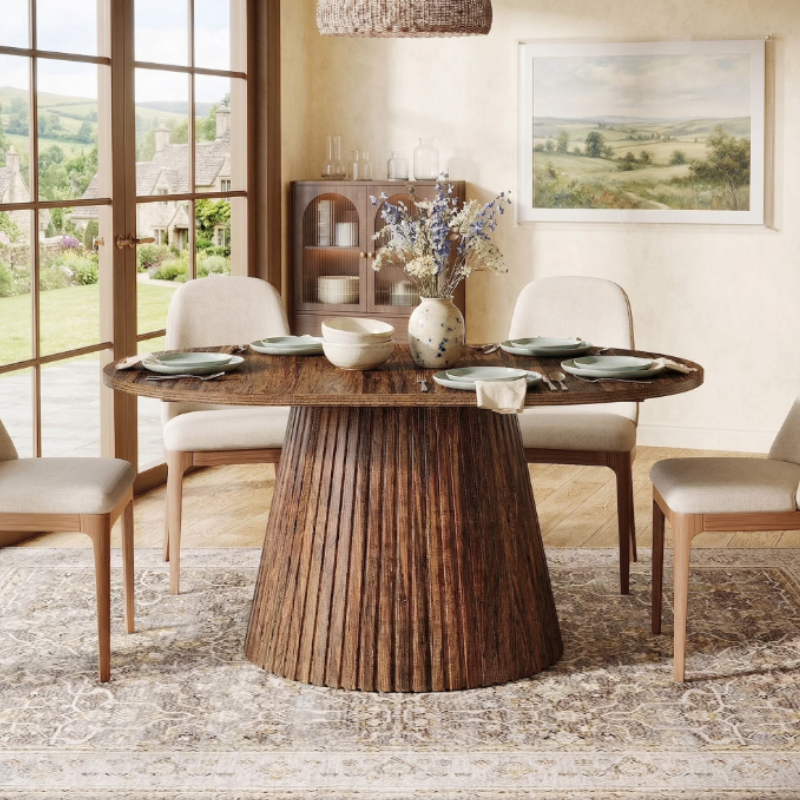 This Fnova 59.06" large dining table comfortably seats 4–6 people for meals and gatherings. Built with a thick heat? and scratch?resistant MDF top and a stable pedestal base. Blending farmhouse warmth with industrial style, this wooden table fits kitchens, dining rooms, offices, and cafes. Easy to assemble with full support—your sturdy, stylish everyday centerpiece!