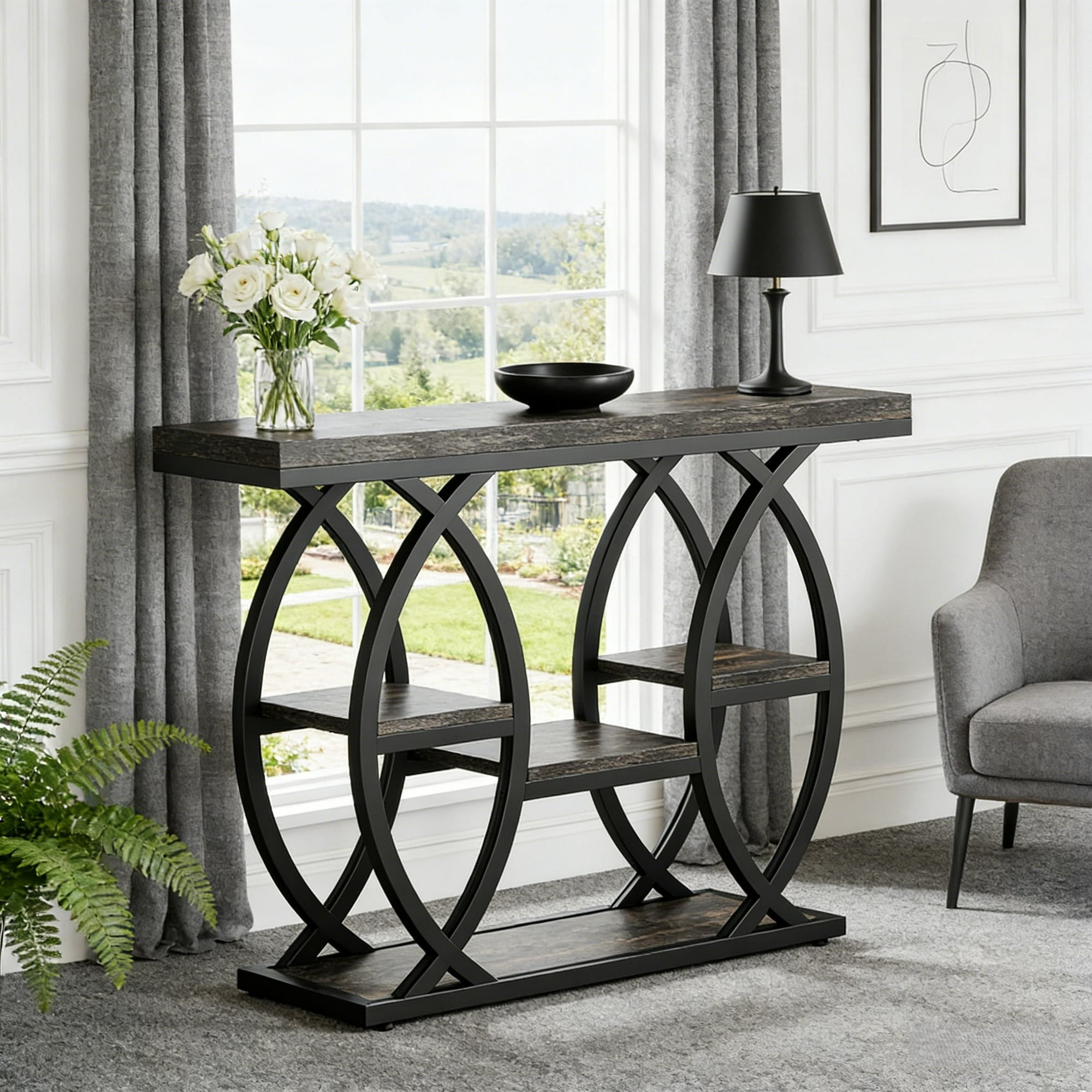 Sale: $159.99This industrial-retro console table pairs a geometric metal base with rustic engineered wood, featuring 4 staggered storage tiers in a narrow 11.81” D x 39.37” W x 31.5” frame for space-saving storage. Its robust structure—1.18” E1 particleboard, heavy metal frame, adjustable feet, and anti-tip device—ensures stability and durability. Waterproof, scratch-resistant, and easy to clean with a damp cloth, it suits busy households. Versatile for small spaces, it works as an entryway, sofa, or hallway table. Available in color variants like wood-metal and marble-gold, it’s easy to assemble with tools and backed by 24-hour service.