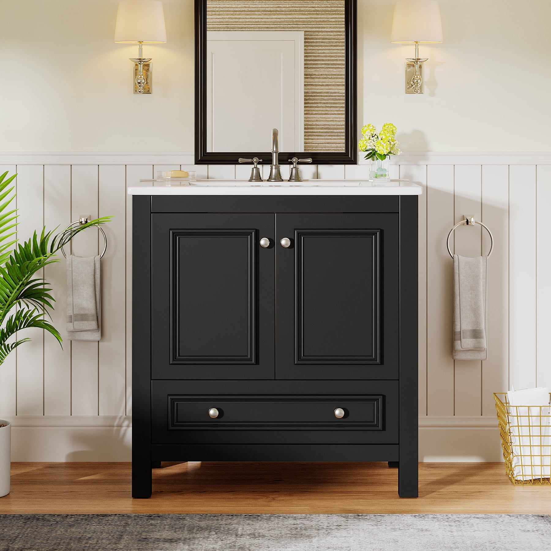 Sale: $499.99Fnova 30" Modern Bathroom Vanity with Sink, Freestanding Bathroom Vanities Cabinet with Ceramic Basin, Bathroom Sink Cabinet with 2 Doors and 1 Drawer, Solid Wooden Frame, Black Crafted from a combination of rubber wood/poplar wood and MDF with a painted finish, this bathroom vanity ensures long-lasting use even in humid environments. The high-quality coating not only enhances its aesthetic appeal but also simplifies maintenance—just a quick wipe keeps it looking new. With ample storage space, the vanity keeps toiletries, towels, and essentials organized and easily accessible, eliminating clutter. Measuring 18"D x 30" W x 34"H, it perfectly balances compactness and functionality. Ideal for modern bathrooms, this vanity blends durability, convenience, and smart storage into one elegant solution.